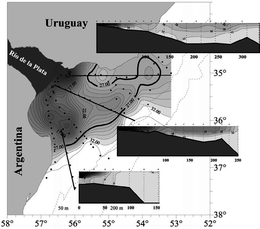 The Rio de la Plata is the widest river on earth because the river pushes far out into the South Atlantic Ocean. The definition of the river is measurable by lack of salinity, but submarine measurement of the river bed also reveals a long, sloping, gradual alluvial fan pushing miles out into the sea. Oceans are rising everywhere as a result of warming temperatures, but here a powerful river pushes back.